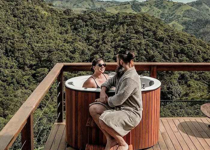 The view of the patio can be admired from the 2-bathroom villa. Cabana Na Montanha Com Ofuro Ao Ar Livre, Churrasqueira, Trilha Com Cascata E Starlink comes with a bathroom with a spa bathtub, a separate toilet, and a shower. Hairdryers, complimentary toiletries, and bathrobes are included for added comfort.